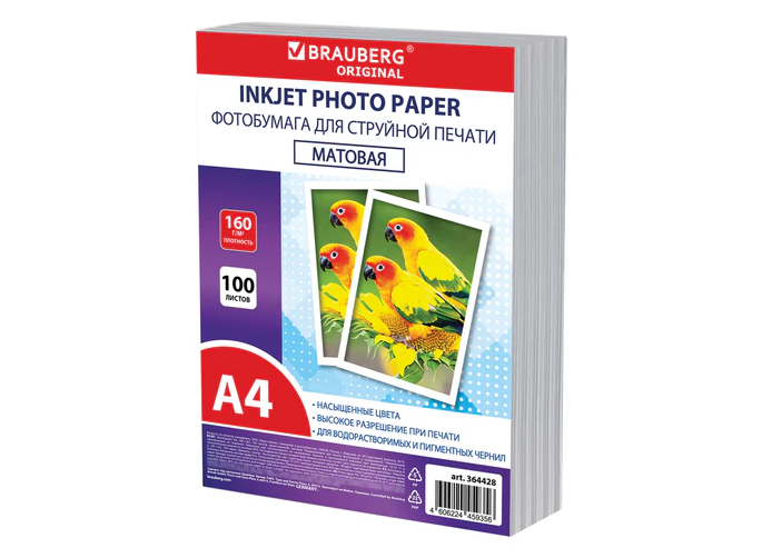 Фотобумага BRAUBERG ORIGINAL для струйной печати А4, 160г/м2, 100л/упак, матовая, 364428
