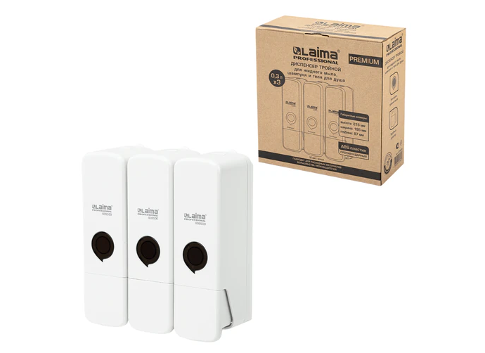 Дозатор 3 в 1, для жидкого мыла/шампуня/геля, 3*0,3 л, LAIMA PREMIUM, наливной, белый /1/ 609500
