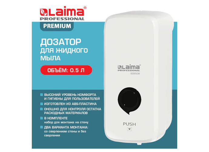 Дозатор для жидкого мыла 0,5л LAIMA PROFESSIONAL PREMIUM, наливной, белый, 609508