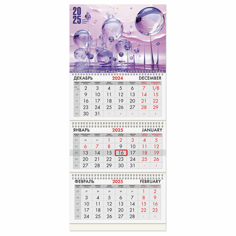 ОписаниеОфисный календарь на 2025 год на 3-х гребнях. Для удобства планирования состоит из 3-х блоков с календарными сетками на три месяца – предыдущего, текущего и последующего. Блок календаря напечатан на мелованной бумаге плотностью 80 г/м2. Подложка изготовлена из мелованного картона плотностью 235 г/м2. Курсор-бегунок выделяет текущую дату. Вертикальное расположение.