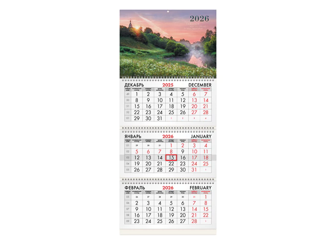 Офисный календарь на 2026 год на 3 гребнях. Для удобства планирования состоит из 3 блоков с календарными сетками на три месяца – предыдущий, текущий и следующий.
