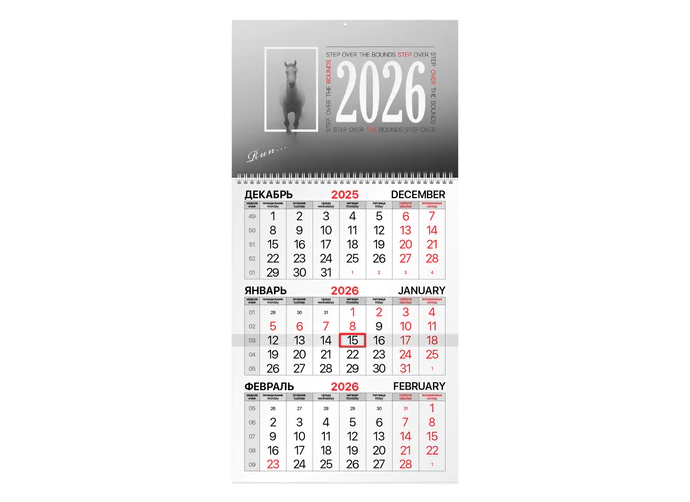 Офисный календарь на 2026 год на гребне. Состоит из 1 блока с календарными сетками на три месяца – предыдущий, текущий и последующий. Блок календаря напечатан на офсетной бумаге плотностью 65 г/м2. Подложка изготовлена из картона плотностью 280 г/м2. Курсор-бегунок выделяет текущую дату. Вертикальный формат. Размер – 29,5х60 см. - Отзывы