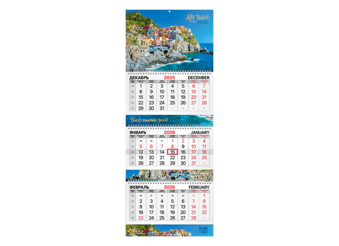 Офисный календарь на 2026 год на 3 гребнях. Для удобства планирования состоит из 3 блоков с календарными сетками на три месяца – предыдущий, текущий и следующий. Курсор-бегунок выделяет текущую дату.