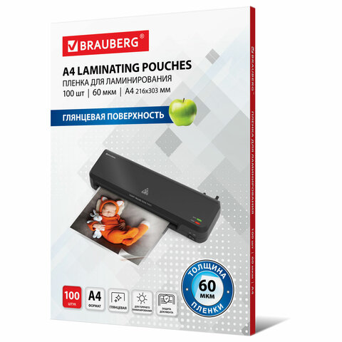 Пленка для ламинирования А4 60мкм, 100шт/уп, BRAUBERG, 531452
