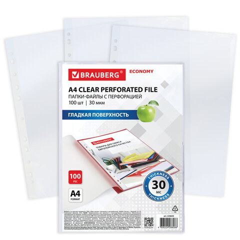 ОписаниеПерфорированные папки-файлы BRAUBERG – идеальное решение для хранения документов в формате А4. Эти офисные принадлежности обеспечивают надежную защиту и систематизацию ваших бумаг. В комплекте 100 шт. глянцевых файлов А4 толщиной 30 мкм гарантируют долговечность и высокое качество
