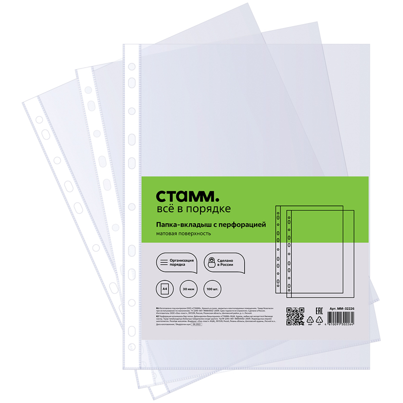 Папка вмещает 50 листов. Перфорация сбоку позволяет прикрепить изделие к любому виду папок на кольцах, а также к папкам со скоросшивателем. Индивидуальная упаковка в пакет с ярким информационным вкладышем. Всего в упаковке 100 штук папок–вкладышей.