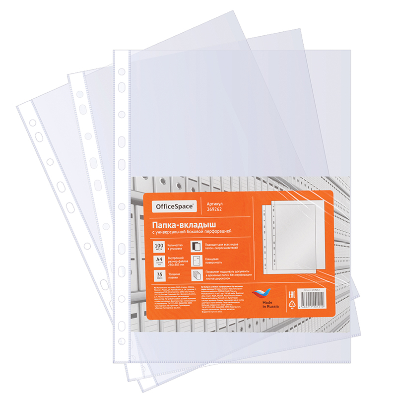 ОписаниеГлянцевые прозрачные файлы-вкладыши OfficeSpace формата А4 размера 305*235 мм имеют универсальную перфорацию для хранения документов формата А4 в любых папках с кольцевым механизмом и скоросшивателем. Вертикальная ориентация, толщина пленки 35 мкм, вместимость файла до 50 листов бумаги, прочные швы. В упаковке 100 штук. Глянцевая поверхность и яркий информационный вкладыш в каждой групповой упаковке.