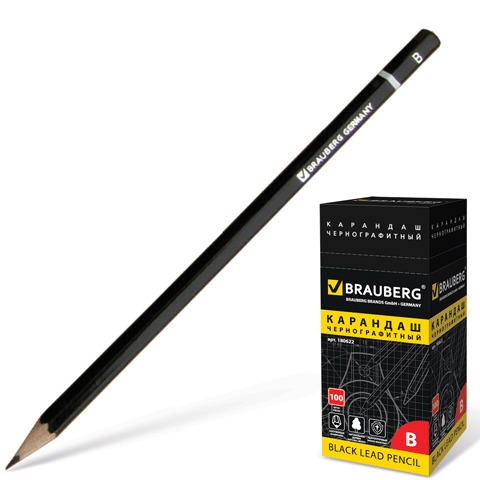 Карандаш чернографитный без ластика, B, дерево, шестигранный, BRAUBERG "Fine Line", корпус черный, 180622