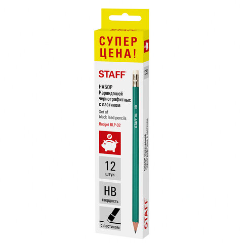Карандаш чернографитный с ластиком, HB, 12шт/упак, пластик, STAFF, 181923