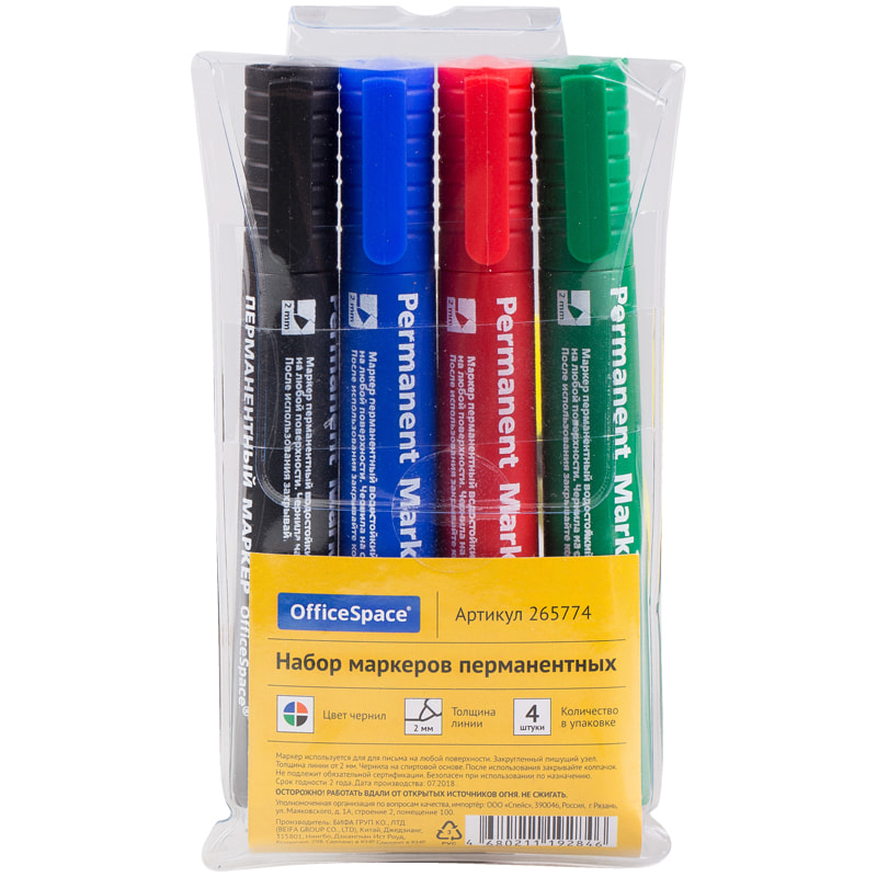 Набор маркеров перманентных 2мм, 4 цвета, OfficeSpace, 265774