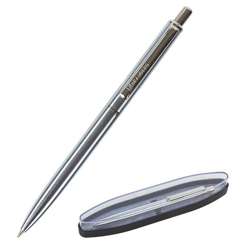 Ручка шариковая синяя BRAUBERG "Larghetto", футляр, корпус серебристый, линия письма 0,5 мм, 143474