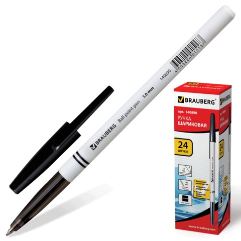 Ручка шариковая черная BRAUBERG "Офисная", корпус белый, линия письма 0,5мм, 140890