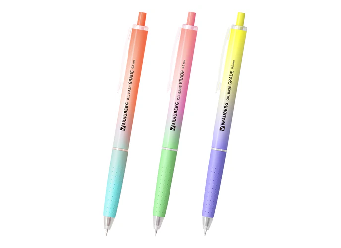 ОписаниеАвтоматическая шариковая ручка BRAUBERG "OIL-BASE GRADE", элегантная модель доступна в трёх нежных пастельных градиентах: голубой-розовый, зелёный-персиковый и фиолетовый-желтый – идеальное сочетание для тех, кто ценит изящность и индивидуальность. Мягкий soft-touch корпус и прорезиненная рукоять обеспечивают комфортное и надежное держание даже во время длительного письма. Благодаря инновационной масляной технологии чернил, вы получите исключительно плавное и мягкое письмо без усилий. Тонкий игольчатый наконечник диаметром 0,5 мм оставляет изящную линию шириной всего 0,3 мм, позволяя создавать точные и аккуратные записи.