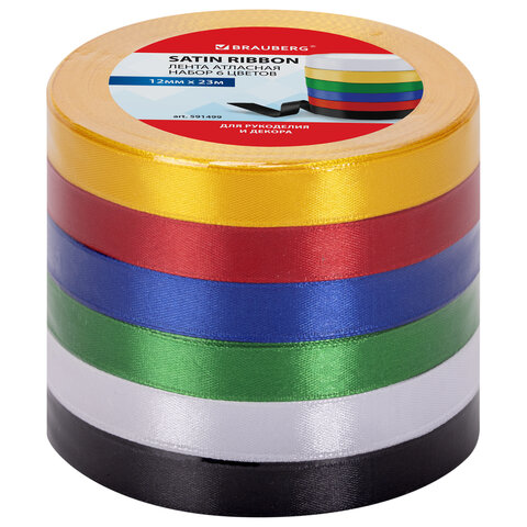 Лента атласная BRAUBERG, набор №1, 6 цветов 12мм*23м, 591499