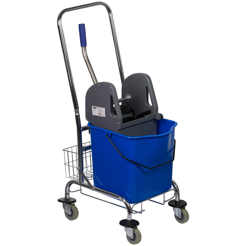 ОписаниеТележка одноведерная имеет стальной каркас, стальные поворотные колеса с пластиковыми протекторами и защитными бамперами, съемное пластиковое ведро 25л с метал. ручкой и носиком для слива воды, механический отжим для петельных тряпок и МОПов, металлическая сетка-лоток для расходных материалов позади ведра.