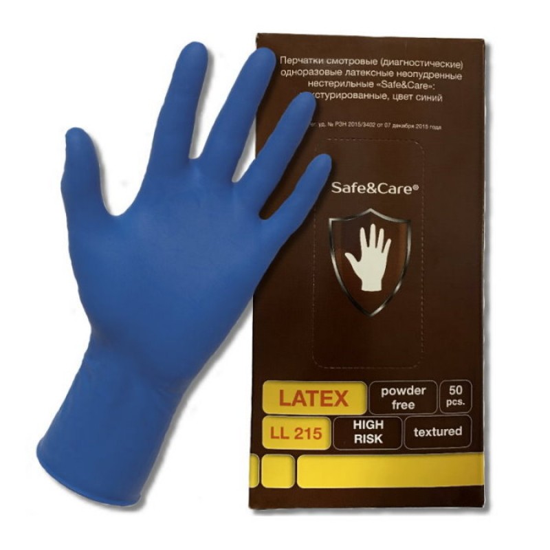 Перчатки латексные синие, М, неопудренные, 25пар/упак /10/ Safe&Care High Risk