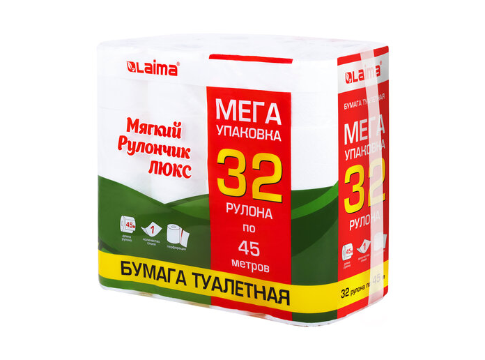 Туалетная бумага на втулке (Т4) LAIMA 1-сл., 45м, 32шт/упак, белая "Мягкий рулончик ЛЮКС "/3/ 114736