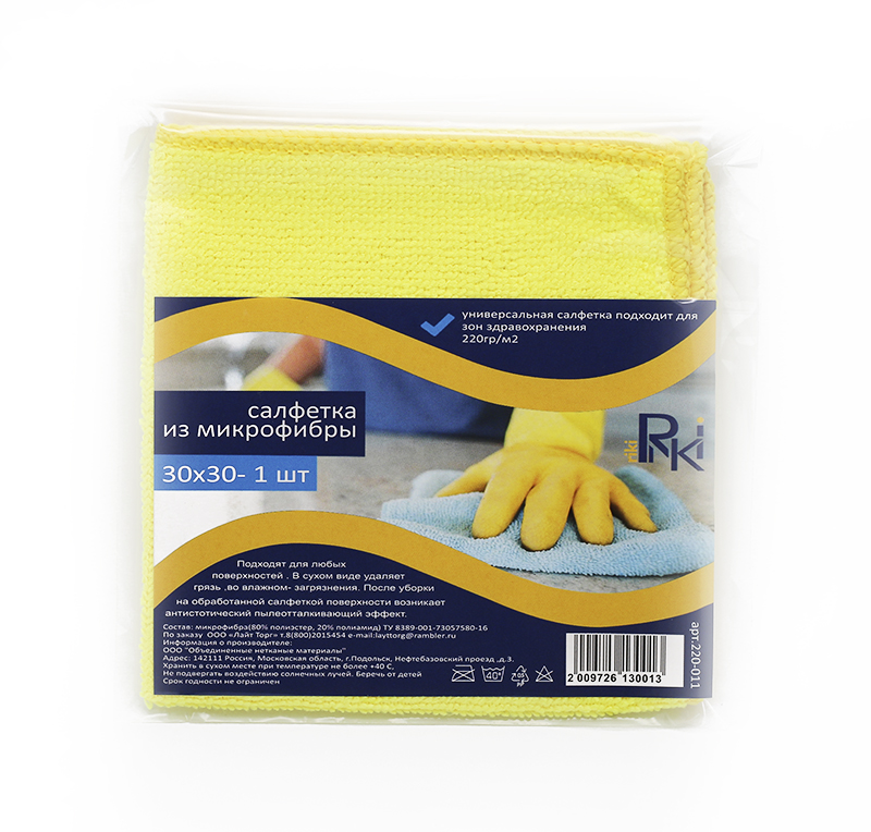 Салфетка микрофибра RiKi 30*30см, желтая, инд. упак, 220г/м /100/ 220-012