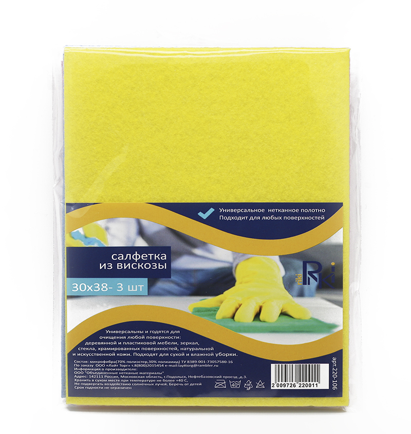 Салфетка вискоза RiKi 30*38см, 3шт/упак, инд. упак, 80г/м2 /100/ 220-106