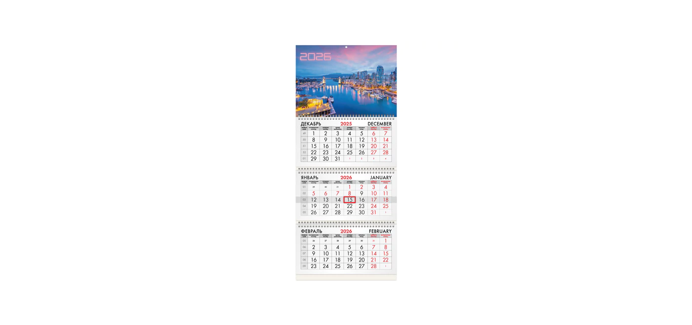 ОписаниеОфисный календарь на 2026 год на 3 гребнях. Состоит из 3 блоков с календарными сетками на три месяца – предыдущий, текущий и последующий. Блок календаря напечатан на офсетной бумаге плотностью 65 г/м2. Подложка изготовлена из мелованного картона плотностью 235 г/м2. Курсор-бегунок выделяет текущую дату. Вертикальный формат.
