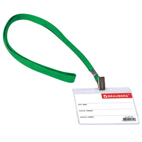 Бейдж BRAUBERG 60х90мм, горизонтальный, зеленая лента 45см /40/ 231153