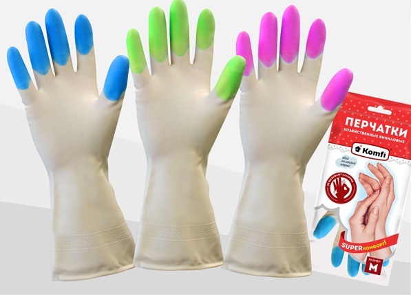 Перчатки резиновые Komfi Сверхпрочные, M /12/ винил, цветные пальцы, 25590